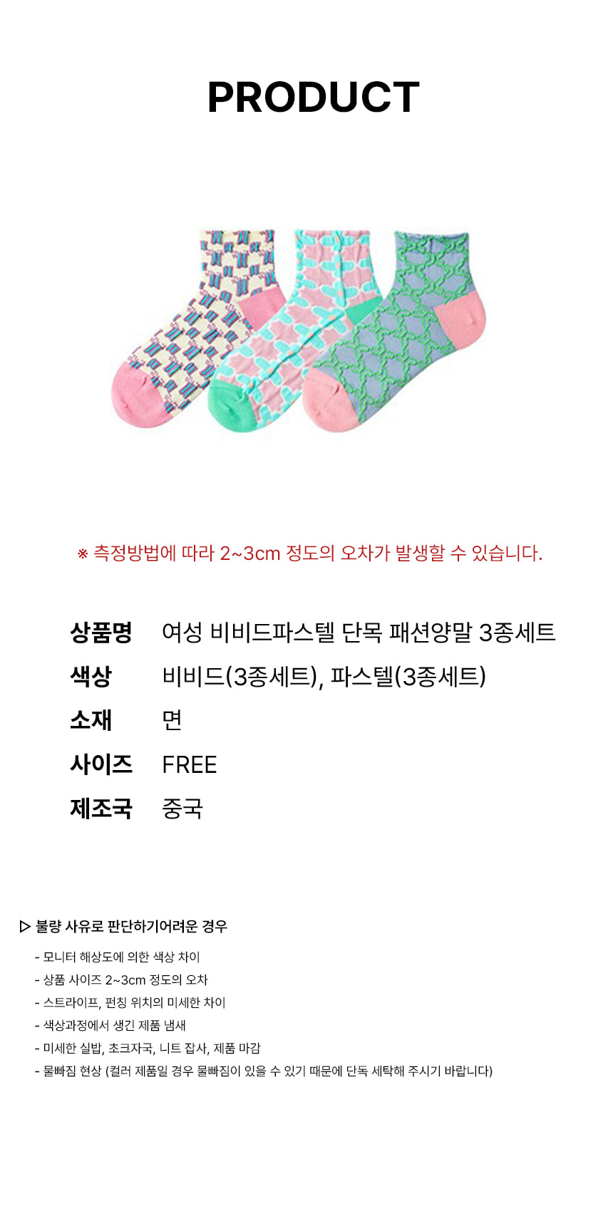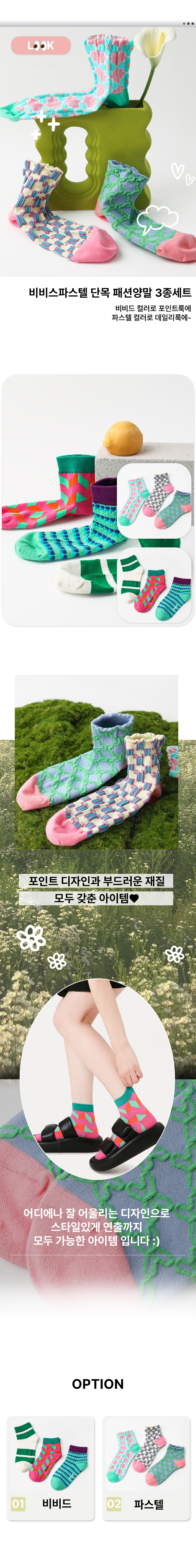 여성 데일리 패션 단목 컬러 양말 3종 세트 비비드