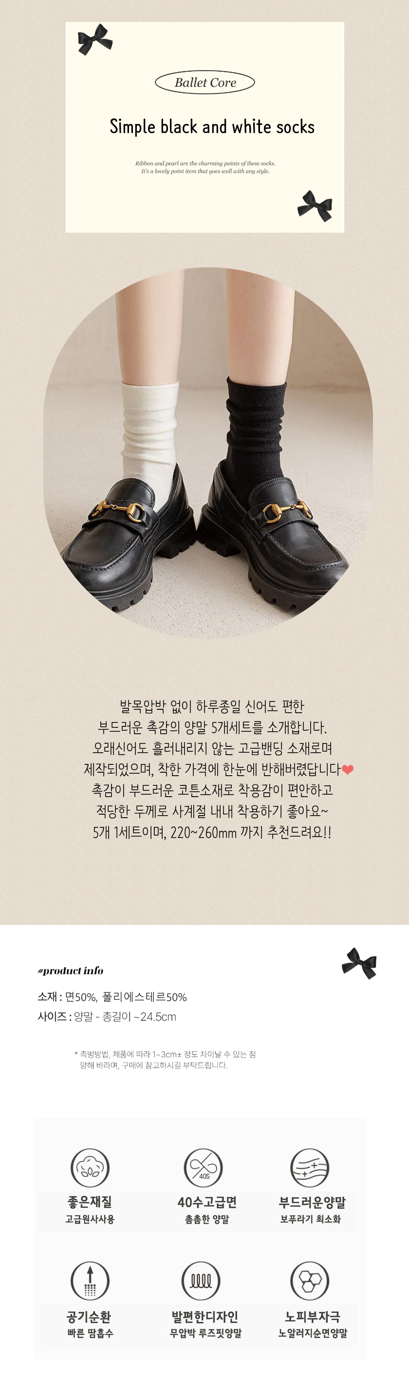 여성 무압박 로퍼 무지 학생 양말 5개 세트