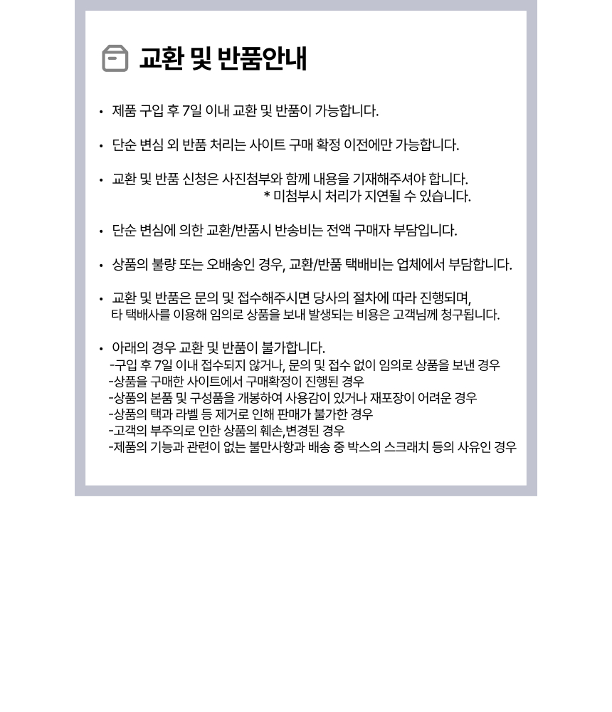 • 단순변심으로 인한 반품 시, 배송 완료 후 7일이 지나면 취소/반품 신청이 접수되지 않습니다.