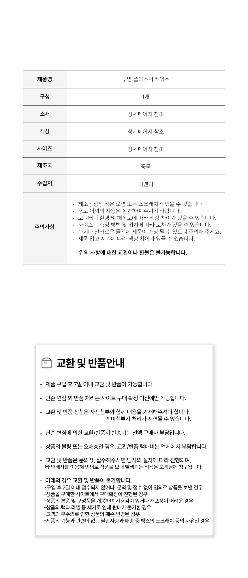 • 단순변심으로 인한 반품 시, 배송 완료 후 7일이 지나면 취소/반품 신청이 접수되지 않습니다.