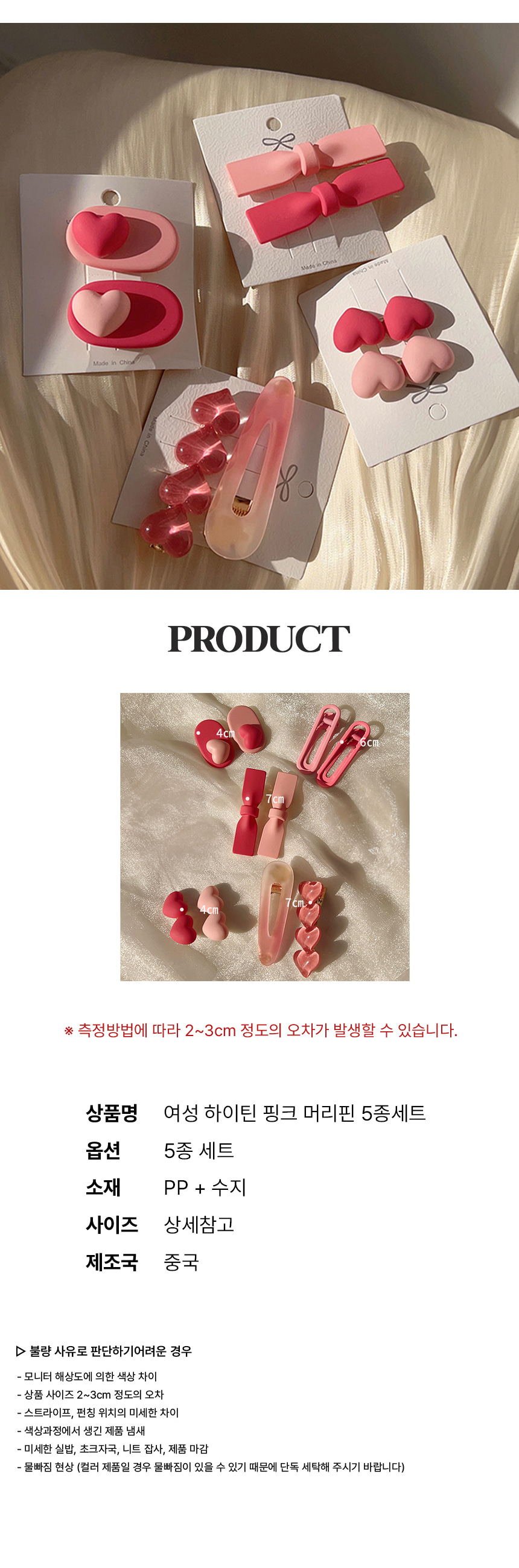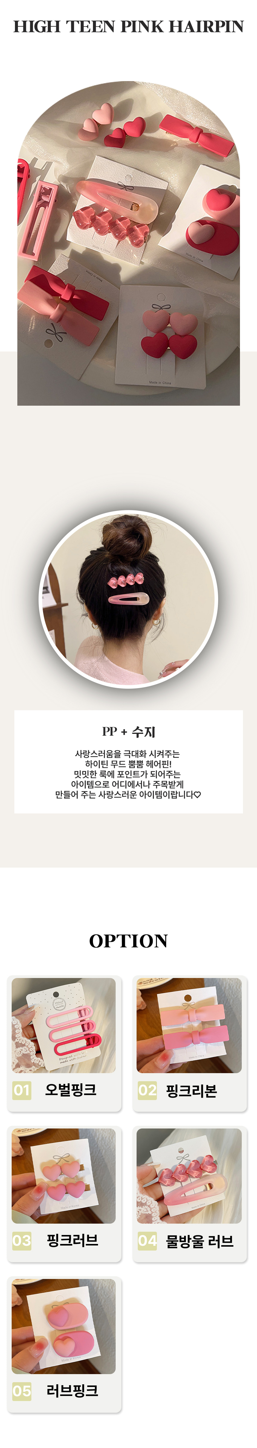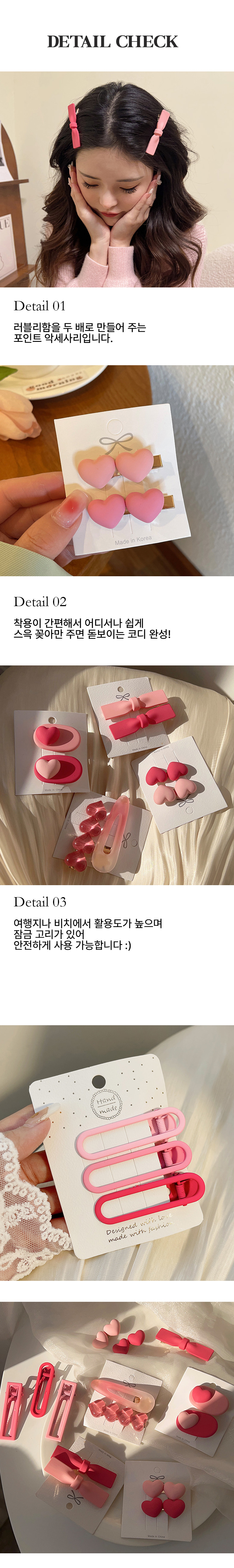 헤어 장식 핑크 하트 리본 핀 앞 옆 머리 삔 5종 세트