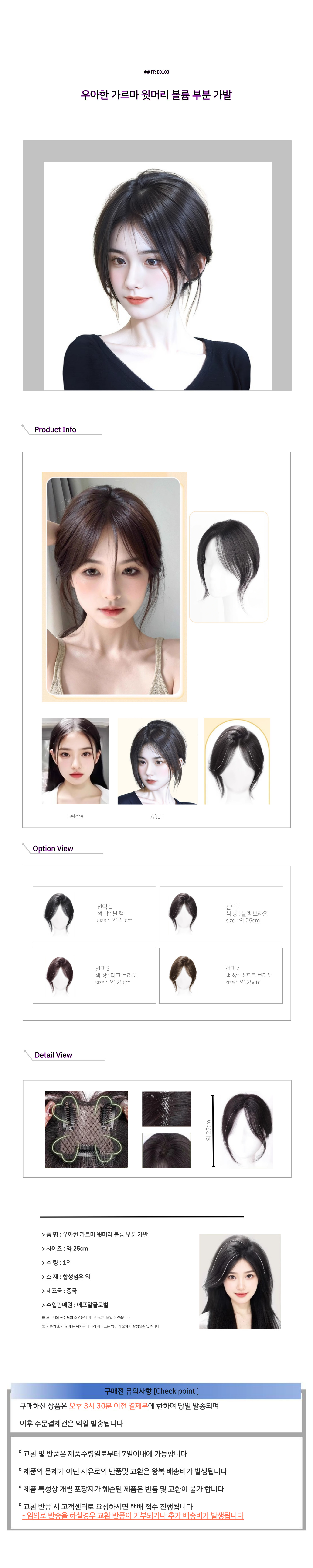 우아한 가르마 윗머리 볼륨 부분 가발