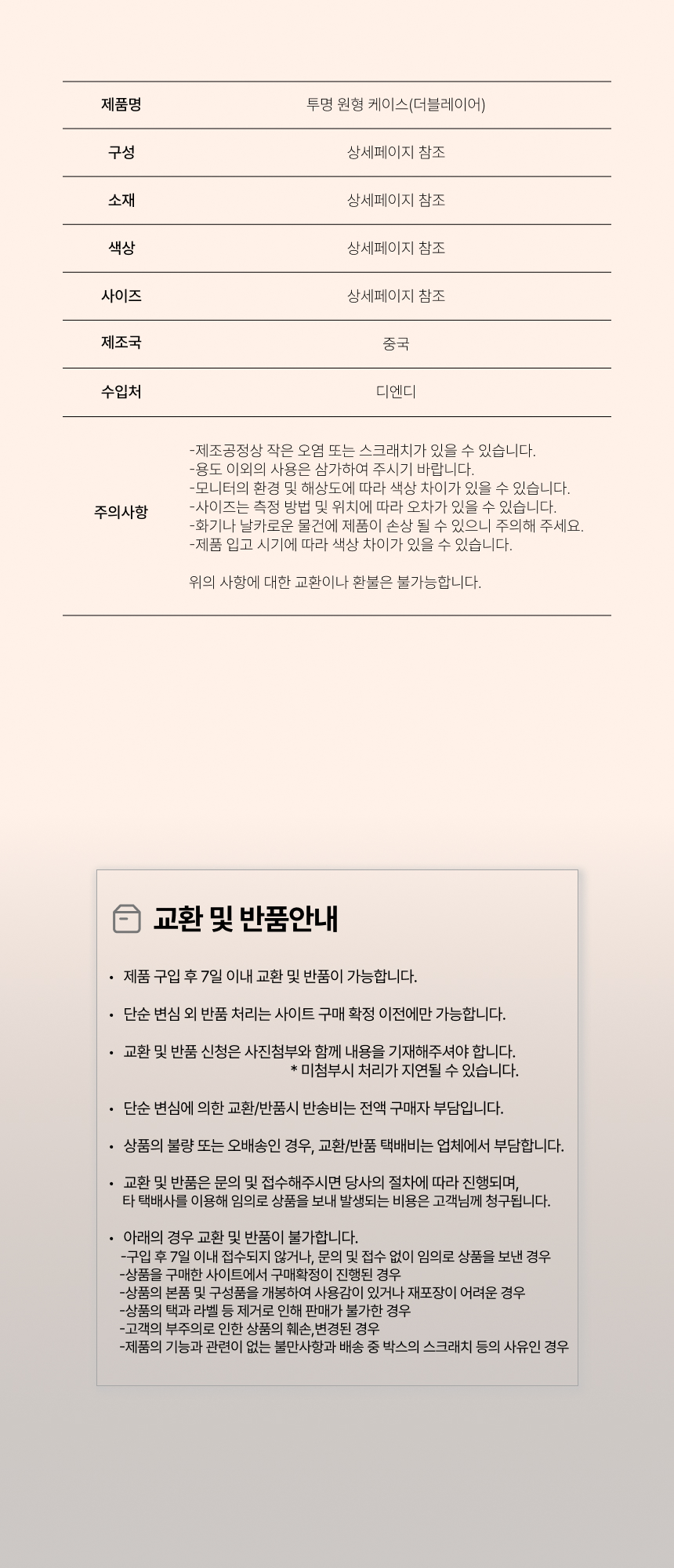 • 단순변심으로 인한 반품 시, 배송 완료 후 7일이 지나면 취소/반품 신청이 접수되지 않습니다.