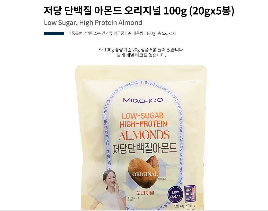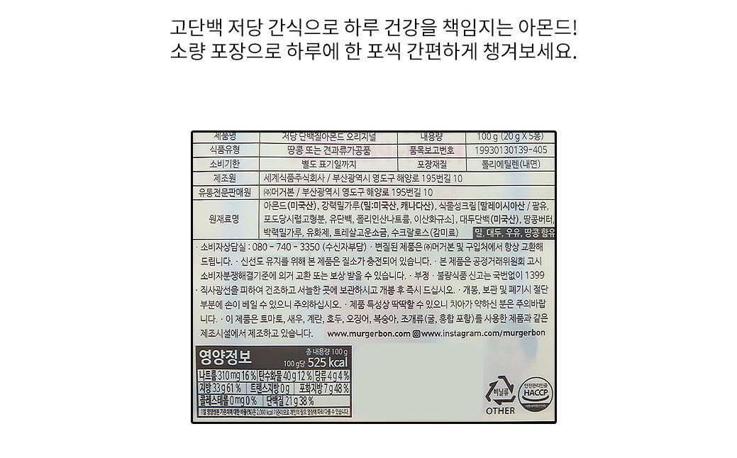 무배) 머거본 저당 단백질 아몬드 오리지널 100g (20gx5봉) 1개