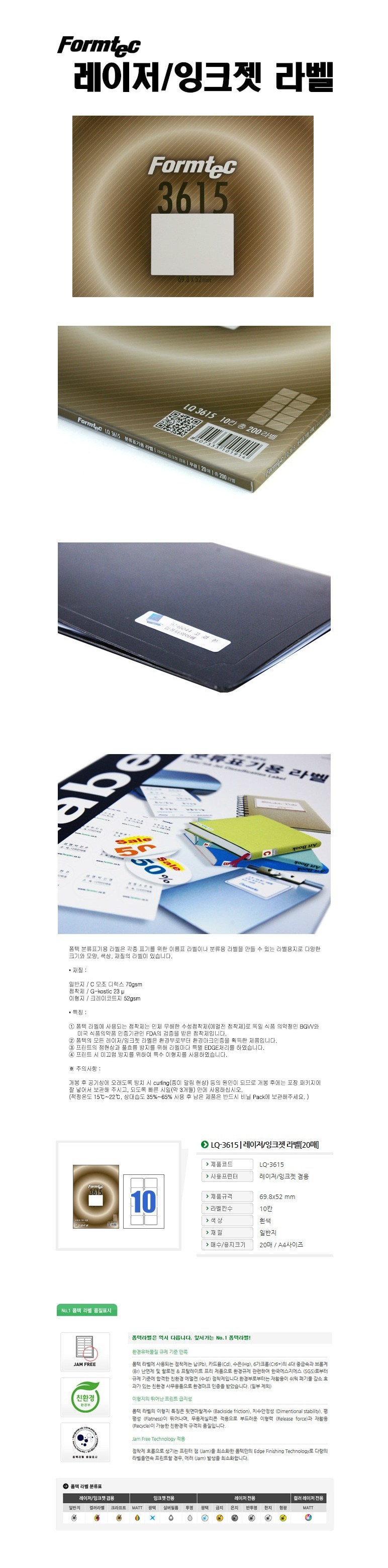 (BE) 폼텍 A4 분류표기용 라벨 LQ-3615 10칸 20매