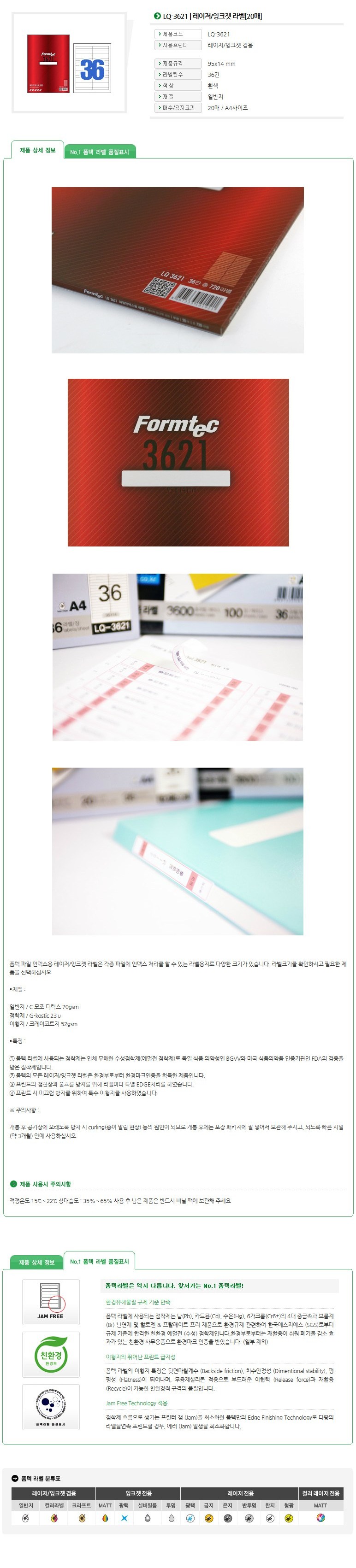 (BE) 폼텍 A4 화일인덱스용라벨 LQ-3621 (36칸20매)