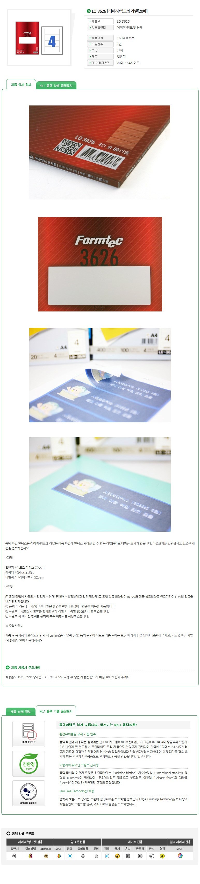 (BE) 폼텍 A4 화일인덱스용라벨 LQ-3626 (4칸20매)