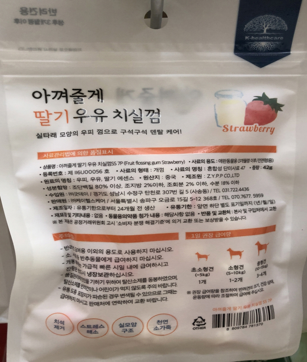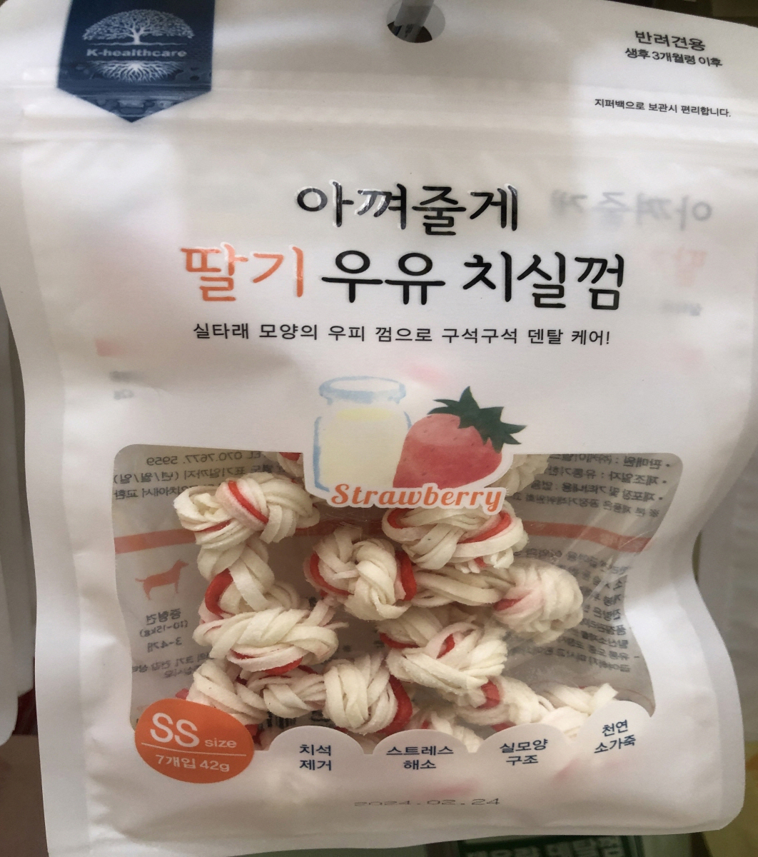 아껴줄게 딸기 우유 치실껌 SS 반려견 사료 7P 42g
