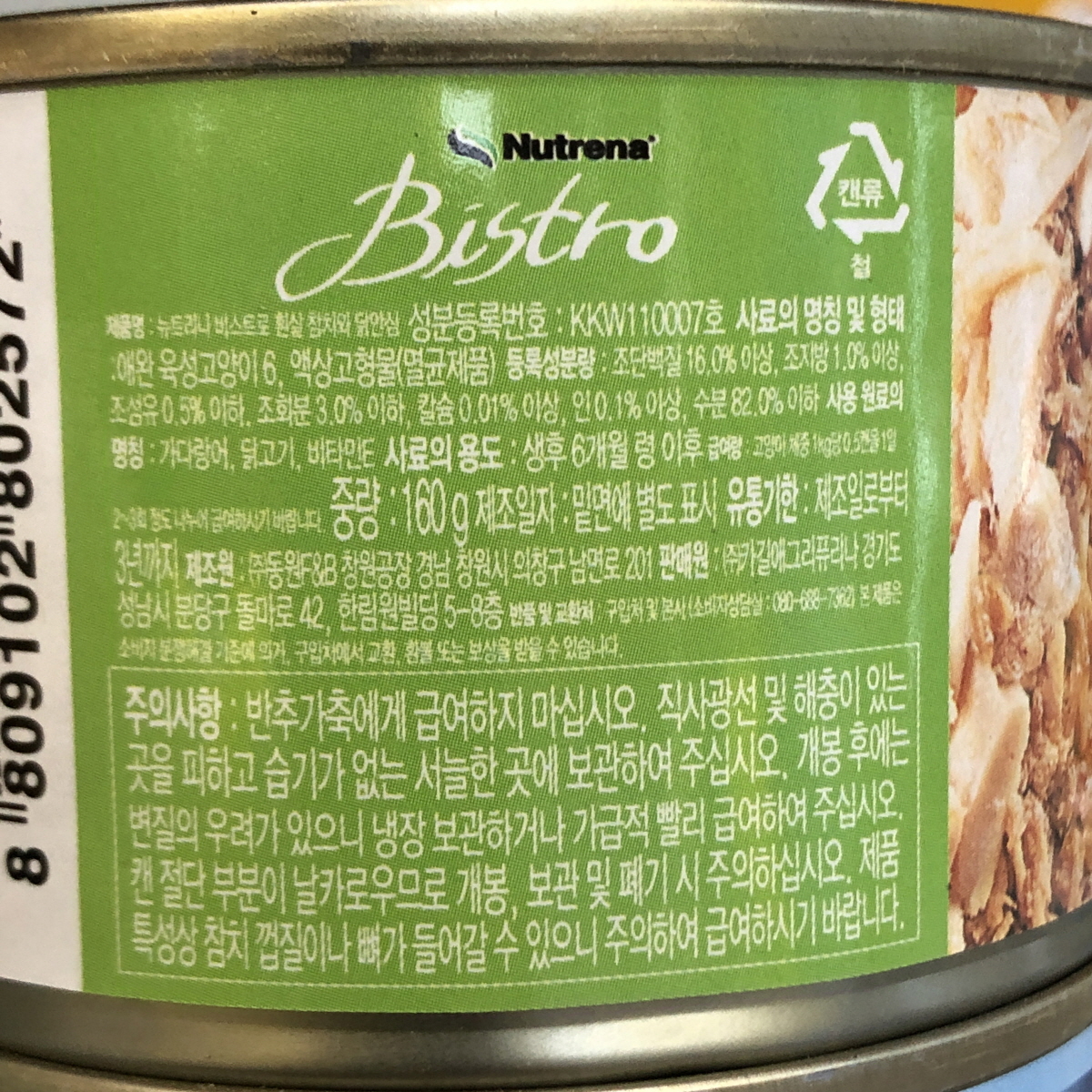 뉴트리나 비스트로 흰살참치 닭안심 반려묘 사료 160g