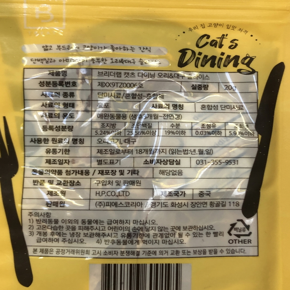 브리더랩 캣츠 다이닝 오리 대구 슬라이스 사료 20g