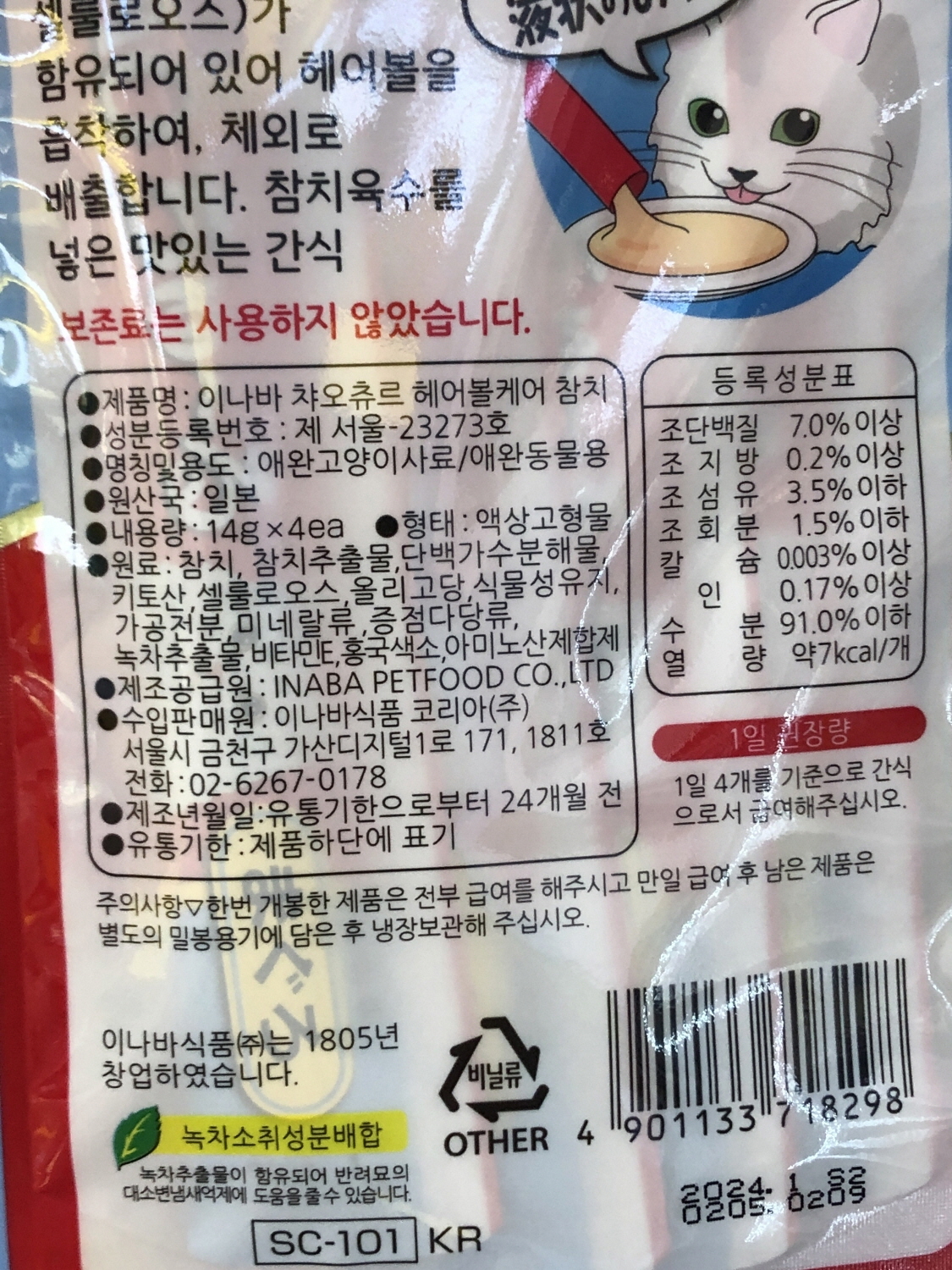 이나바 차우츄르 헤어볼케어 참치 반려묘 사료 14gX4P