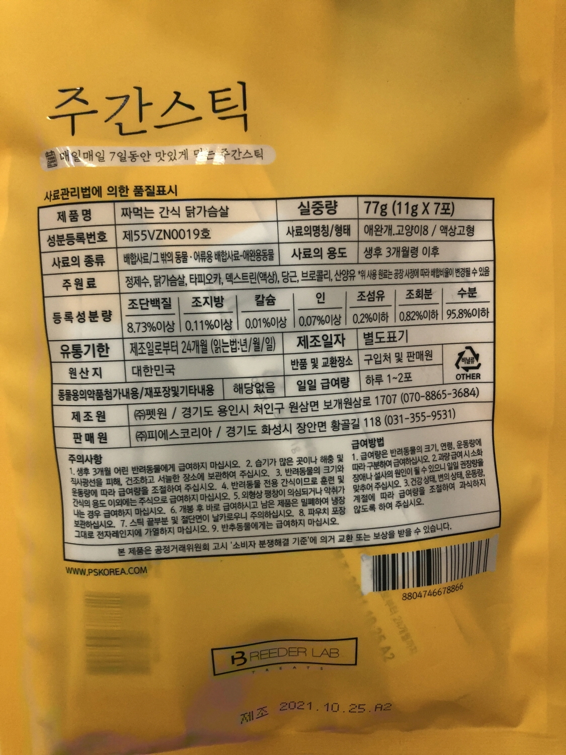 주간스틱 짜먹는 간식 닭가슴살 반려묘 사료 11gX7P