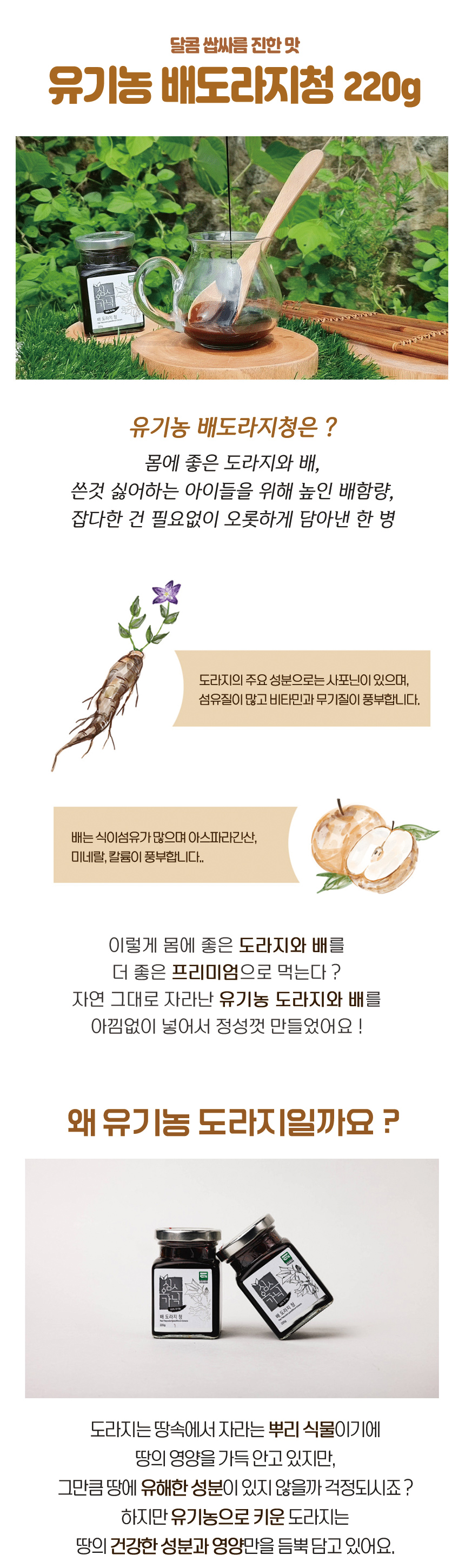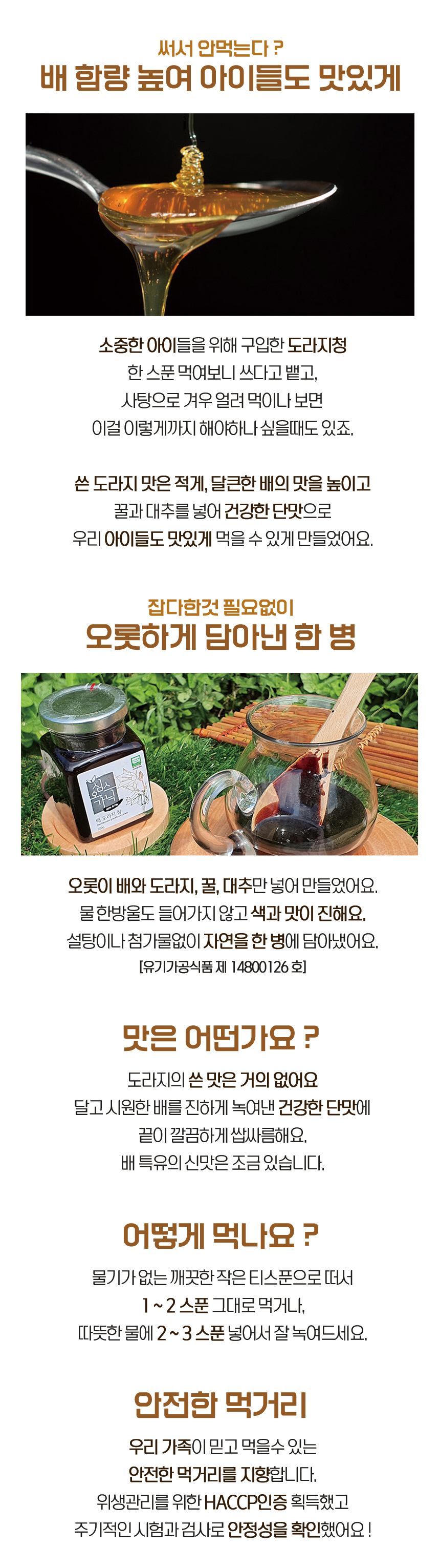 | 원재료명/함량 | 유기농 배(국내산) 84% 유기농 도라지(국내산) 10% 유기농 대추(국내산) 3% 벌꿀(국내산) 3% |