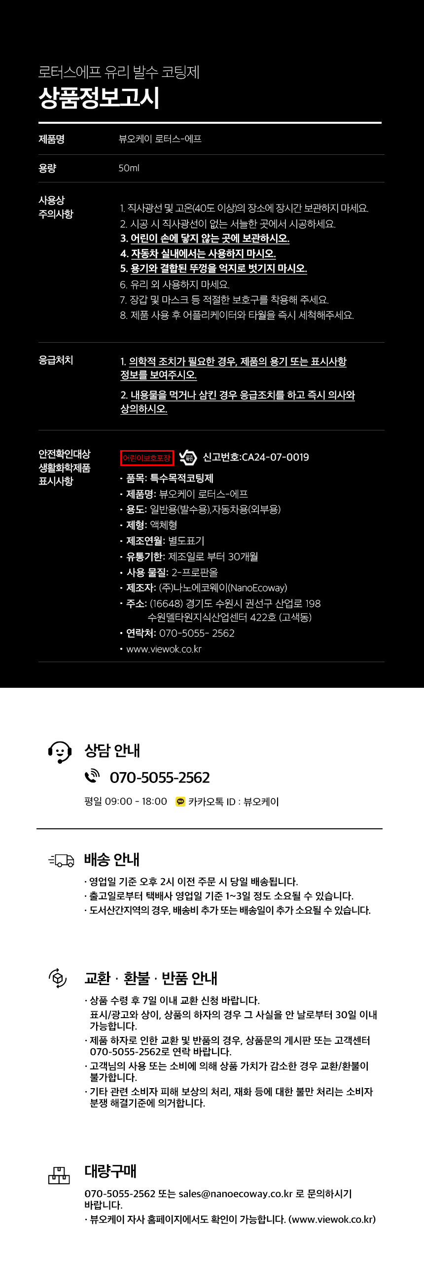 | 제품하자가 아닌 소비자의 단순변심, 착오구매에 따른 청약철회 시 소비자가 부담하는 반품비용 등에 관한 정보 | 배송ㆍ교환ㆍ반품 상세설명페이지 참고 |