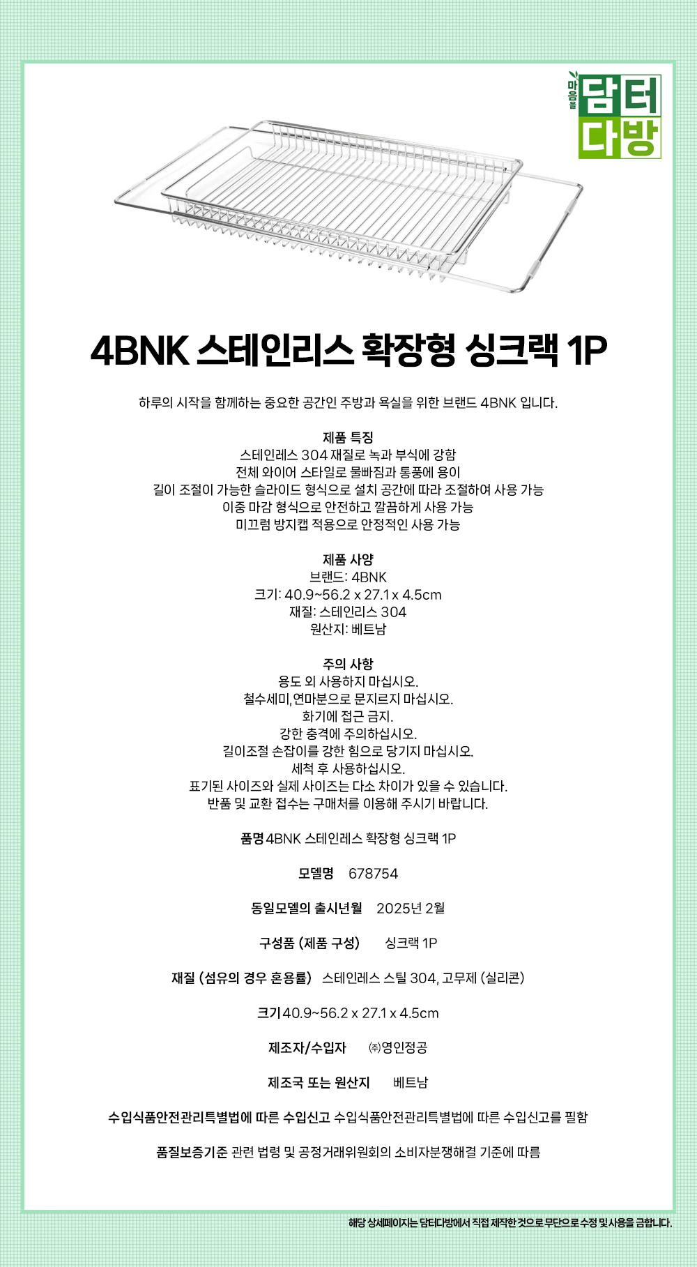 4BNK 스테인리스 확장형 싱크랙 1P