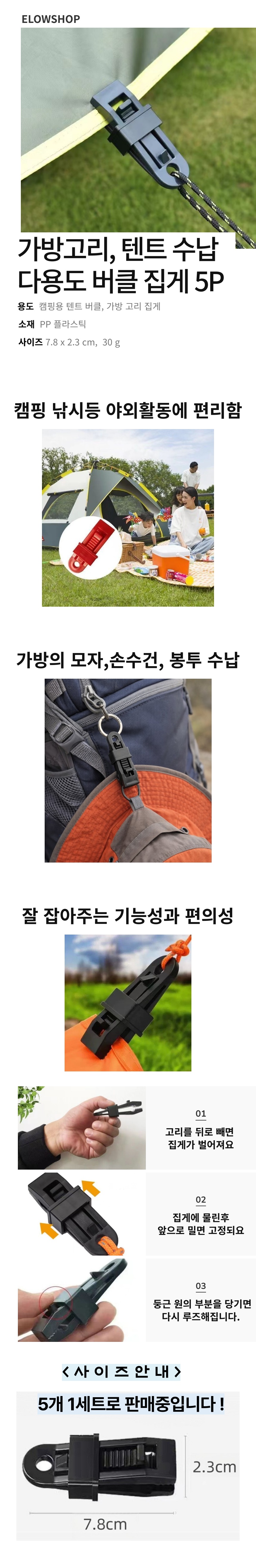 캠핑 텐트 등산 가방 고정 버클 클립 집게 5P