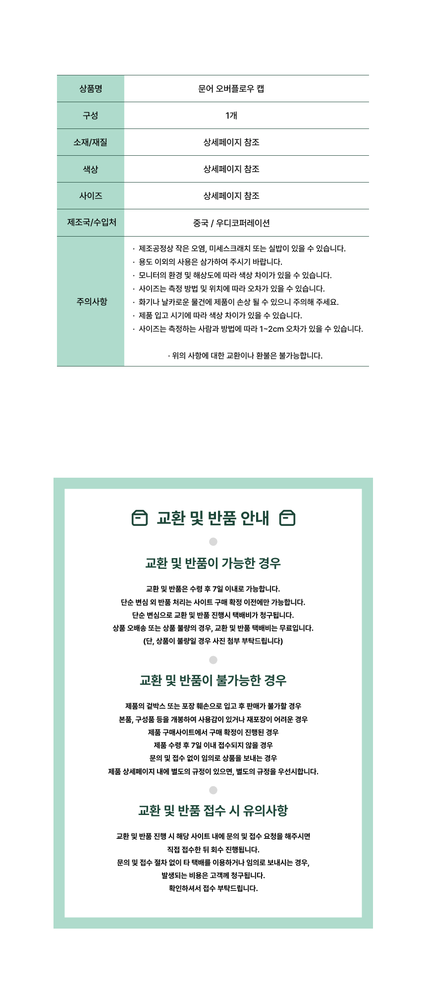 • 단순변심으로 인한 반품 시, 배송 완료 후 7일이 지나면 취소/반품 신청이 접수되지 않습니다.